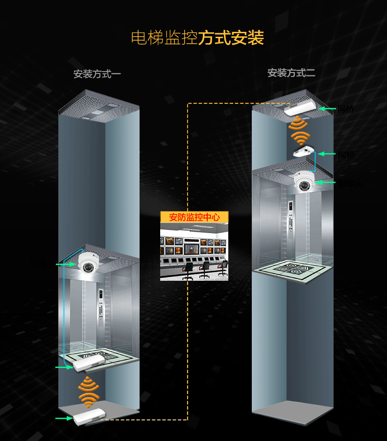 電梯頂部已全部封閉而底部留有空隙空間進(jìn)行設(shè)備安裝,這種情況下,在電梯轎廂底部安裝一臺(tái)面向下的電梯專用無線網(wǎng)橋,并在樓層最底端安裝一臺(tái)面向上得電梯專用無線網(wǎng)橋進(jìn)行數(shù)據(jù)傳輸,再通過網(wǎng)線接到就近的光纖處,使用附近的光纖把視頻數(shù)據(jù)傳回機(jī)房,最后使用硬盤錄像機(jī)集中在大屏上顯示,整套方案:安裝簡(jiǎn)單并使用光纖傳輸,節(jié)約成本。