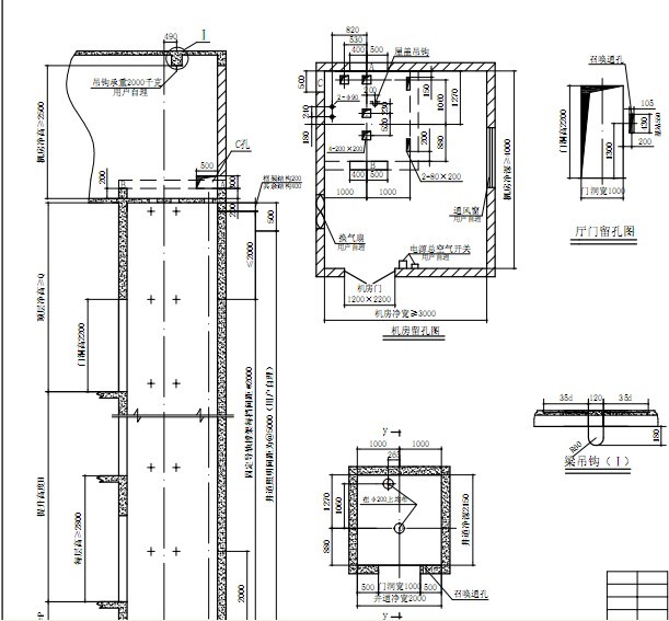 四是要注意機(jī)房地面的留洞和頂面的吊鉤,還有機(jī)房門的凈寬要求和通路要求。